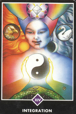 Изображение интеграции - это таинственный союз, смешение противоположностей. Сейчас время общения двойственностей жизни, пережитых раньше. Так же, как ночь противоположна дню, темнота скрывает свет, а вместе они создают единое целое, где бесконечно одно превращается в другое, и каждое содержит в своей глубине семя противоположного. Орел и лебедь, оба существа полета и величественности. Орел олицетворяет силу и одинокость. Лебедь - олицетворение пространства и чистоты, мягко плывущий и погружающийся в стихию эмоций, совершенно удовлетворенный и целостный в своем совершенстве и красоте. Мы - союз орла и лебедя, мужского и женского, огня и воды, жизни и смерти. Карта интеграции - это символ самосоздания новой жизни и мистического союза, иначе это известно как алхимия.