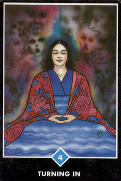 На лице изображенной здесь женщины - легкая улыбка. На самом деле она наблюдает за ужимками ума, не судя, не пытаясь остановить их, не отождествляясь, только наблюдает, как если бы они были уличным движением или рябью на поверхности пруда. Ужимки ума даже слегка забавны, как если бы он прыгал вверх и вниз и крутился так и эдак, пытаясь привлечь ваше внимание и соблазнить вас игрой. Одним из величайших благословений является развитие навыка сохранения дистанции с умом. В действительности это и есть медитация - не произнесение мантры или повторение утверждения, а просто наблюдение, как если бы ум принадлежал кому-то другому. Сейчас вы готовы сохранять эту дистанцию и наблюдать за представлением без того, чтобы оказаться вовлеченным в драму. Всегда, когда это возможно, доставляйте себе удовольствие в испытании истинной свободы. Поворот вовнутрь, и навык медитации будет расти и углубляться в вас.