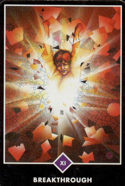 Преобладание красного на этой карте показывает с одного лишь взгляда, что ее содержание - это энергия, сила и прочность. Сверкающее свечение исходит из солнечного сплетения или центра силы фигуры, а в ее позе - бьющая через край энергия и решительность. Каждый из нас время от времени достигает точки, когда ″уже хватит″. В такие периоды кажется, что мы должны сделать что-то, что-нибудь, даже если потом это окажется ошибкой, сделать, чтобы сбросить весь груз и все то, что ограничивает нас. Если мы не сделаем этого, то есть угроза, что сама наша жизненная энергия будет удушена и искалечена. Если вы сейчас чувствуете, что ″уже хватит″, позвольте себе разбить старые образцы и ограничения, которые не дают течь вашей= энергии. Сделав это, вы будете изумлены теми жизненными силами и возможностями, которые может принести в вашу жизнь прорыв.