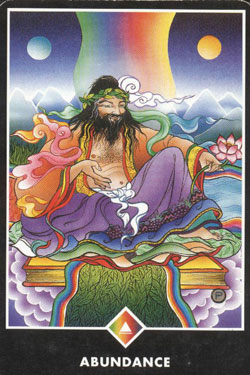 Характер Дионисия - в самом портрете целостного человека - Зорбы-Будды, который может пить вино, танцевать на берегу, петь под дождем и в то же самое время наслаждаться глубинами понимания и мудрости. В одной руке он держит лотос, показывающий, что он почитает и сам содержит в себе грацию женственности. Его открытая грудь (открытое сердце) и расслабленный живот показывают, что он также хорошо знаком и со своей мужественностью. Он совершенно самодостаточен. Все четыре элемента - земля, огонь, вода и небо - соединены в Короле Радуг, сидящем на камне мудрости жизни, Если вы - женщина, Король Радуг дает поддержку вашей собственной мужской энергии в вашей жизни, поддерживает соединение с вашим внутренним мужчиной. Эта карта для мужчин означает время прорыва через общепринятые мужские стереотипы и позволяет светиться наполненности целостного человеческого существа.