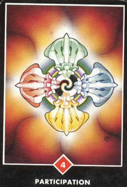 Каждая фигура в этой мандале держит левую руку ладонью вверх в позиции принятия и правую руку ладонью вниз в позиции отдачи. Весь круг создает огромное энергетическое поле, которое принимает форму двойного ДОРДЖА - тибетского символа грома и молнии. Мандала обладает качеством, которое несет в себе энергетическое поле, образующееся вокруг Будды. В мандале все индивидуальности принимают участие в создании круга, тем самым внося уникальный вклад в образовании единого жизненного целого. Это похоже на цветок, чья целостность более прекрасна, чем сумма его частей, и в то же время эта целостность усиливает красоту каждого лепестка. У вас сейчас есть возможность участвовать с другими и внести свой вклад в создании чего-то великого и более прекрасного, чем мог бы каждый из вас сделать один. Ваше участие не только поддержит вас, но и внесет что-то драгоценное в целое.
