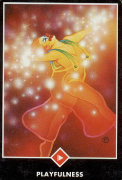 Жизнь редко бывает настолько серьезна, насколько мы полагаем. И когда мы узнаем это, жизнь отвечает нам все большими и большими возможностями игры. Женщина на этой карте празднует радость того, что она живет. Она похожа на бабочку, которая в обещании света возникла из куколки. Она напоминает нам то время, когда мы были детьми, искали ракушки на берегу моря, строили замки из песка, не беспокоясь о том, что волна может снять их в следующий момент. Она знает, что жизнь это игра, и она играет роль клоуна сейчас без всякого чувства смущения и без притворства. Когда Паж Огня входит в вашу жизнь, это знак того, что вы готовы к свежему, к новому. Что-то прекрасное на горизонте, и у вас есть нужное качество игривой невинности и чистоты, чтобы приветствовать это, раскрыв объятия.
